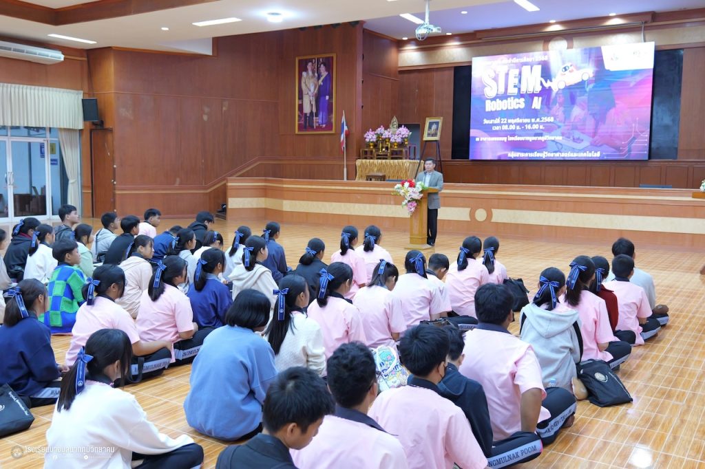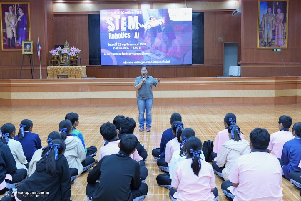 วันที่ 22 พฤศจิกายน 2568 นายธนพล ฉ่ำเพียร ผู้อำนวยการโรงเรียนบางมูลนากภูมิวิทยาคม พร้อมด้วย นายภูวดล ชื่นอยู่ รองผู้อำนวยการกลุ่มบริหารงานวิชาการ เป็นประธานเปิดกิจกรรม ค่ายบูรณาการ STEM Robotics AI ณ หอประชุมเพชรชมพู โดยมีนักเรียนเข้าร่วมจำนวน 60 คน พร้อมด้วยคณะครูผู้สอนด้านวิทยาศาสตร์–เทคโนโลยี และ นักเรียนพี่เลี้ยง ที่ช่วยดูแลและให้คำแนะนำอย่างใกล้ชิด