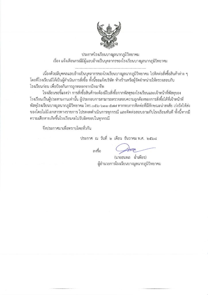 ประกาศแจ้งเตือนกรณีมีผู้แอบอ้างเป็นบุคลากรของโรงเรียนบางมูลนากภูมิวิทยาคม