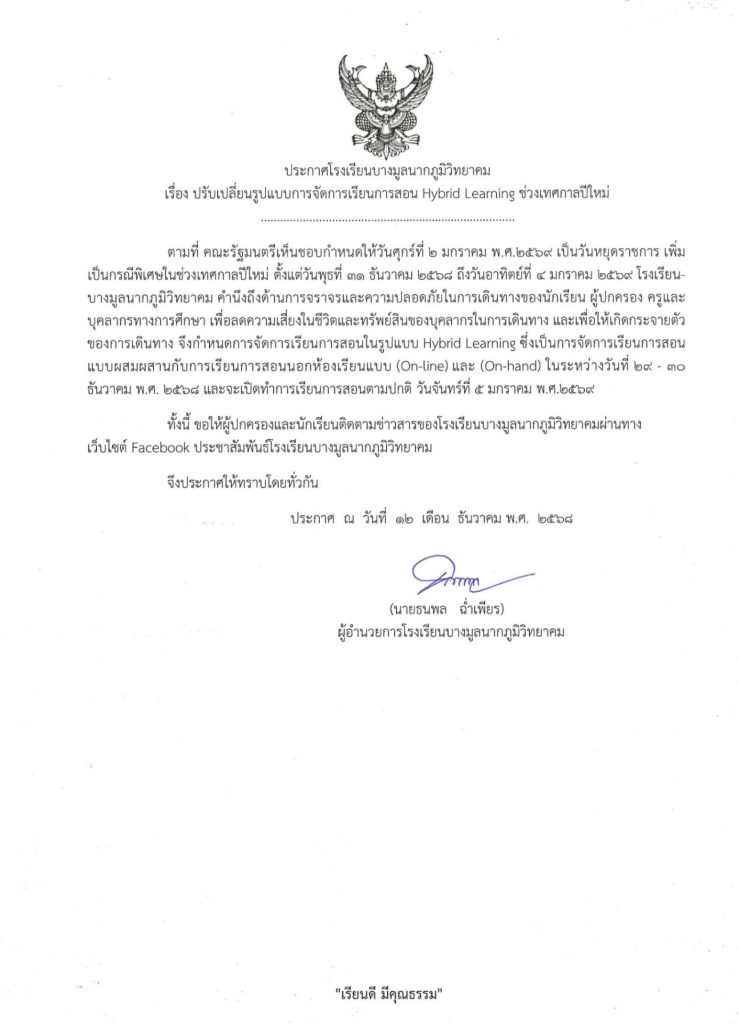 โรงเรียนบางมูลนากภูมิวิทยาคม คำนึงถึงด้านการจราจรและความปลอดภัยในการเดินทางของนักเรียน ผู้ปกครอง ครูและบุคลากรทางการศึกษา เพื่อลดความเสี่ยงในชีวิตและทรัพย์สินของบุคลากรในการเดินทาง และเพื่อให้เกิดกระจายตัวของการเดินทาง จึงกำหนดการจัดการเรียนการสอนในรูปแบบ Hybrid Learning ซึ่งเป็นการจัดการเรียนการสอนแบบผสมผสานกับการเรียนการสอนนอกห้องเรียนแบบ (On-line) และ (On-hand) ในระหว่างวันที่ 29 – 30 ธันวาคม พ.ศ. 2568 และจะเปิดทำการเรียนการสอนตามปกติ วันจันทร์ที่ 5 มกราคม พ.ศ. 2569