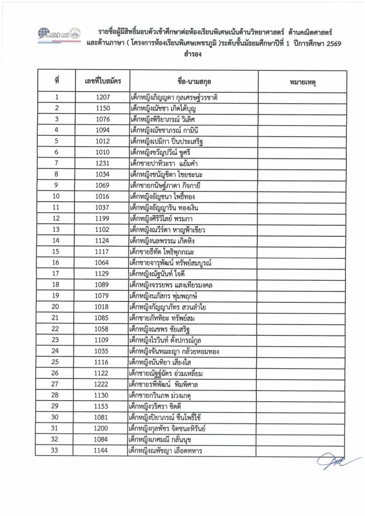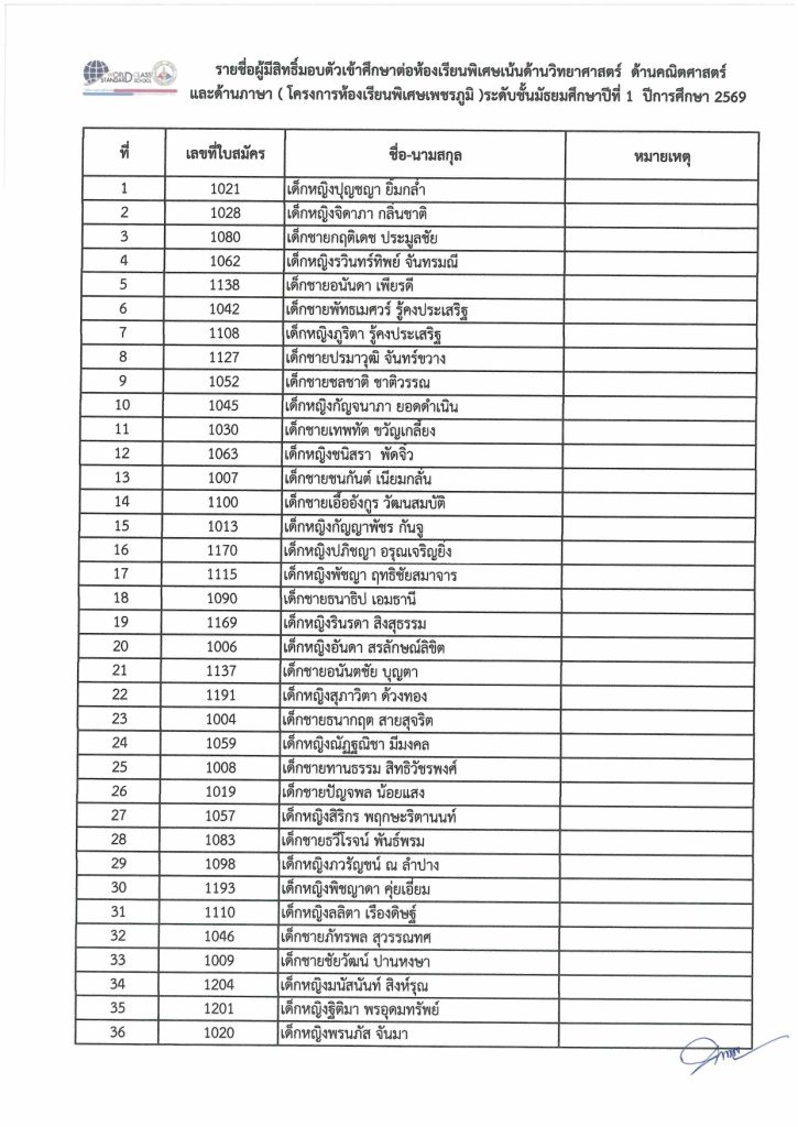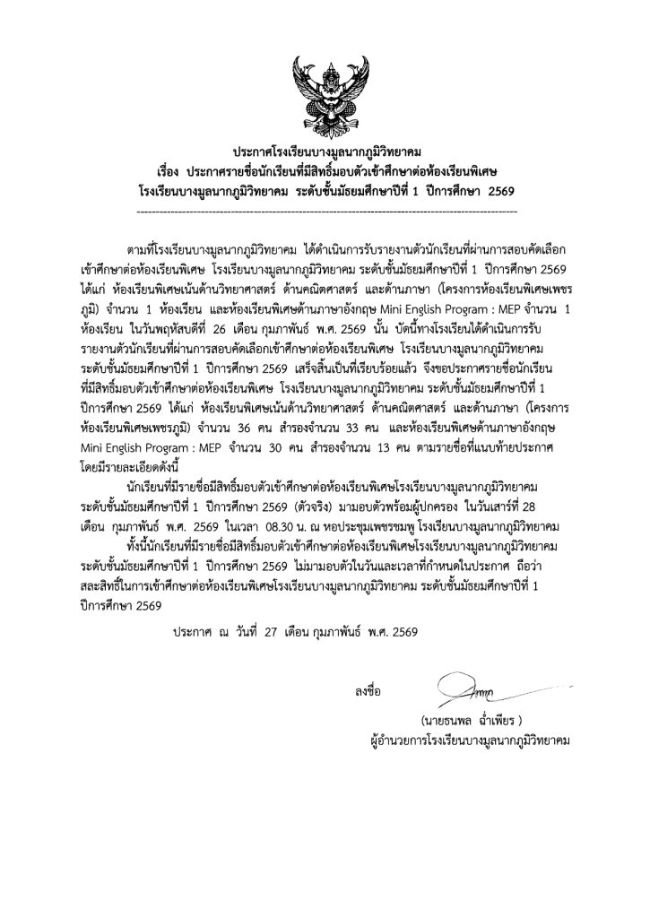 ประกาศรายชื่อนักเรียนที่มีสิทธิ์มอบตัวเข้าศึกษาต่อห้องเรียนพิเศษ ระดับชั้นมัธยมศึกษาปีที่ 1 ปีการศึกษา 2569